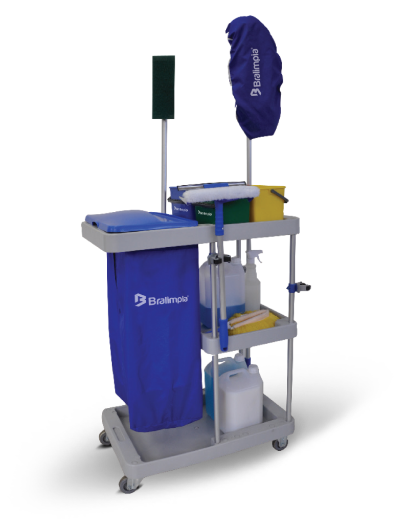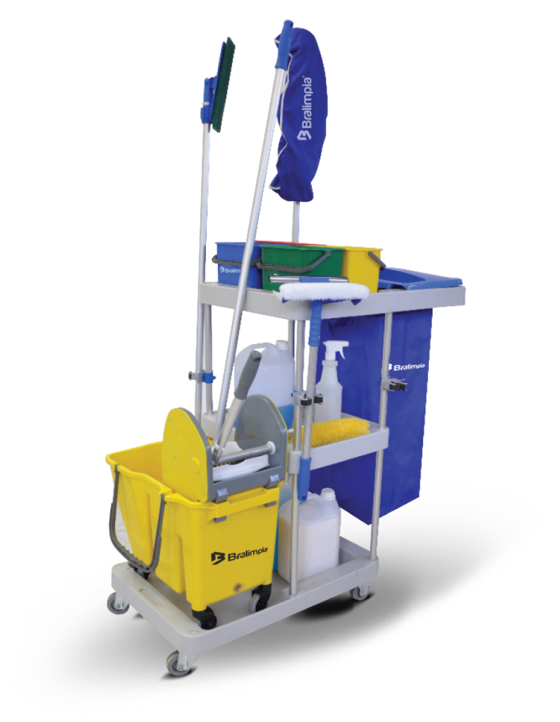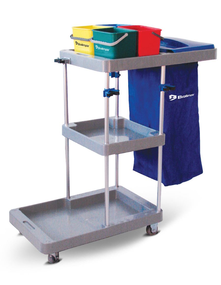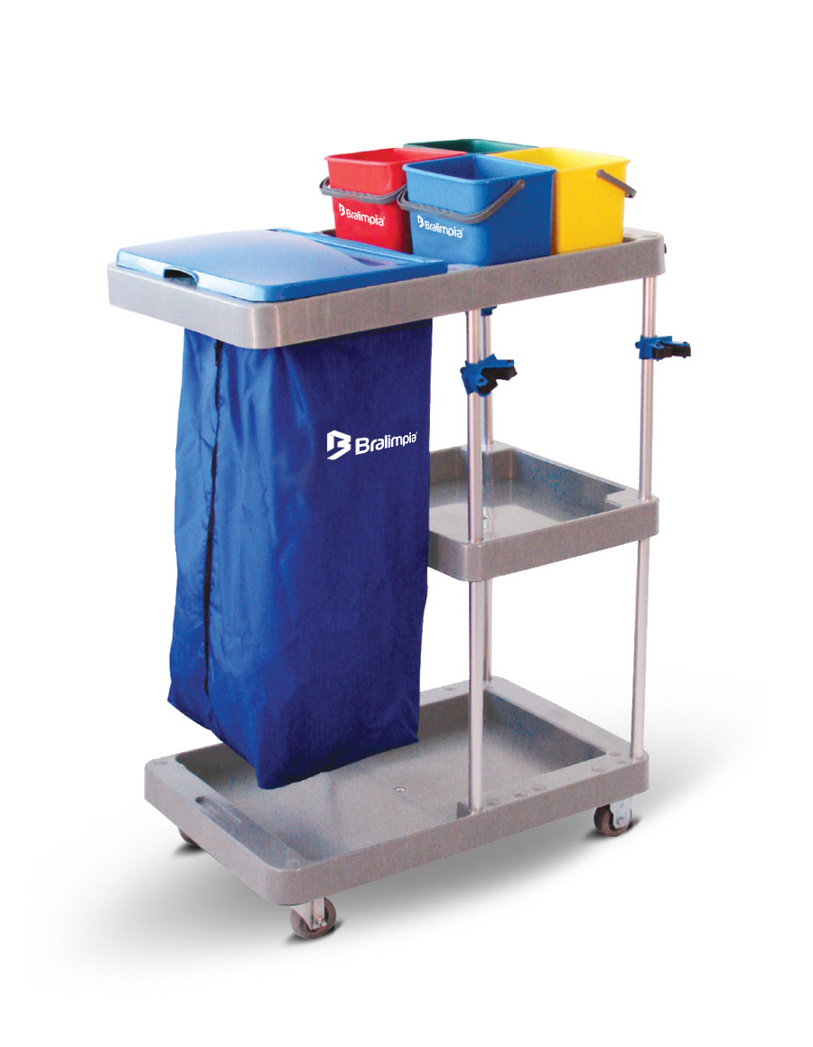Carro funcional modular para tareas de higiene y transporte de residuos, fabricado en Polipropileno y estructura tubular de aluminio. Se destina al transporte de utensilios y productos químicos diversos, permitiendo que todos los equipos que componen el sistema de limpieza sean transportados de una sola vez. Utilizado en la limpieza e higienización de hospitales, shoppings, industrias, supermercados, restaurantes, entre otros.